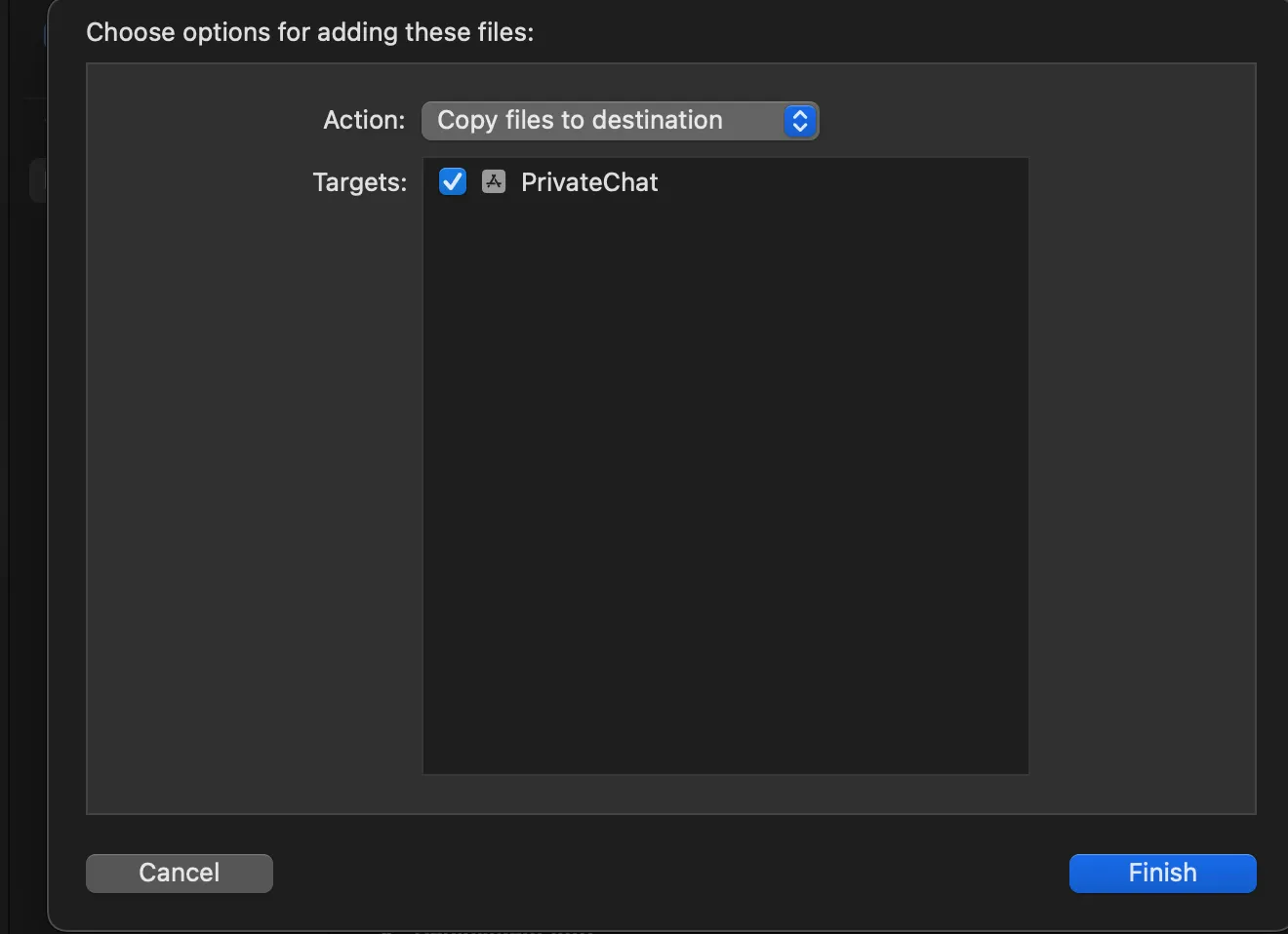 Open your Xcode IOS project and directly drag and drop your file under the folder name of your project , once you do that you will receive this dialog box