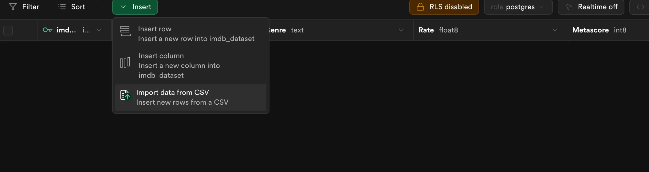 Now create a table with these columns imdb_id(as primary key) , created_at (Both these columns would be already present just rename id as imdb_id) , Title , Certificate , Duration , Genre , Rate(datatype float8) , Metascore(int8) , Description(text) , Cast(text) , Info(text) .